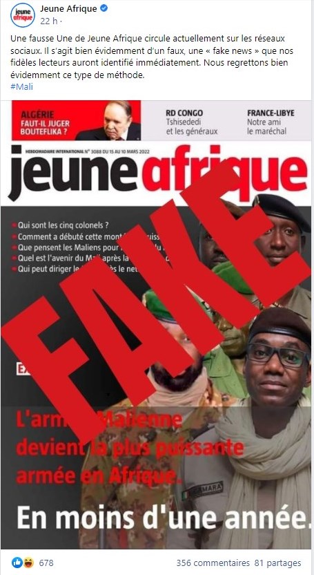 Dans un démenti publié le 8 mars sur son compte Facebook, Jeune Afrique a d'ailleurs qualifié cette couverture de "fake news".