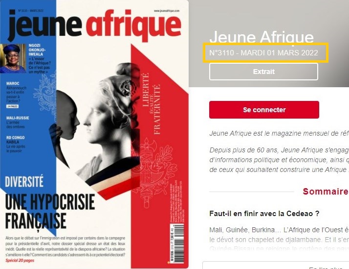 Aucune édition ne correspond à ces données. Le numéro 3088 de Jeune Afrique a été publié le 15 mars 2020 et avait à sa Une le président ivoirien Alassane Ouattara. Et le numéro le plus récent a été publié le 1er mars 2022 avec un buste de Marianne de profil en Une. Ces deux éditions n’ont absolument rien à voir avec le visuel qui circule sur le Mali et qui semble inspiré du numéro 3088 de mars 2020.