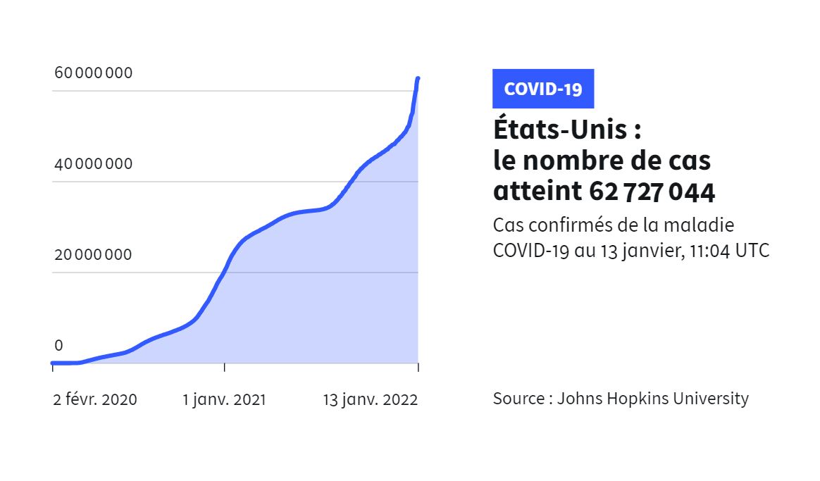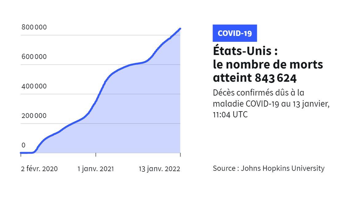 Au 13 janvier, aux Etats-Unis, 62.727.044 cas et 843.624 décès liés au Covid-19 ont été enregistrés, selon les données collectées par l'AFP auprès des autorités sanitaires. Au 12 janvier, 247.695.845 personnes étaient entièrement vaccinées dans le pays, c'est-à-dire 74,6% de la population américaine, selon les données publiées sur le site des CDC.