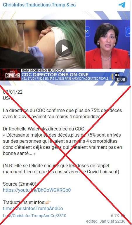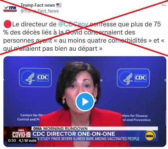"La directrice du CDC confirme que plus de 75% des décès avec le Covid avaient 'au moins 4 comorbidités'", affirment des publications relayant une vidéo, partagées quelques centaines de fois en français sur Twitter et Facebook, et vues plusieurs milliers d'autres sur Telegram et repris par des blogs, depuis le 11 janvier.