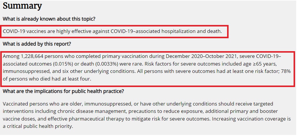 D'après ces recherches, "toutes les personnes [vaccinées] ayant développé une forme grave [du fait de l'infection par le Covid-19] présentaient quatre comorbidités/facteurs de risques ou plus ; et 77,8 % des personnes décédées présentaient quatre facteurs de risque ou plus." Les complications graves causées par le Covid-19 chez les personnes ayant terminé un cycle de vaccination, c'est-à-dire ayant reçu la première et la deuxième dose de vaccin, sont "rares", explicite encore la publication.