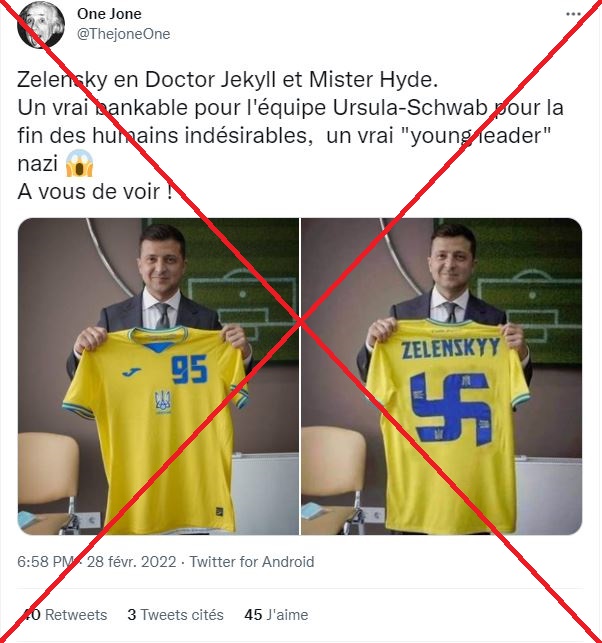 "Zelensky... un vrai "young leader" nazi", commente un internaute en publiant la photo sur son compte Twitter. C'est un exemple parmi de nombreuses publications sur Twitter et sur Facebook, suggérant l'adhésion du président ukrainien aux idéaux nazis. En commentaire, l'internaute met quiconque au défi de prouver qu'il s'agit d'un montage photo. C'est bien le cas : la photo a été manipulée.