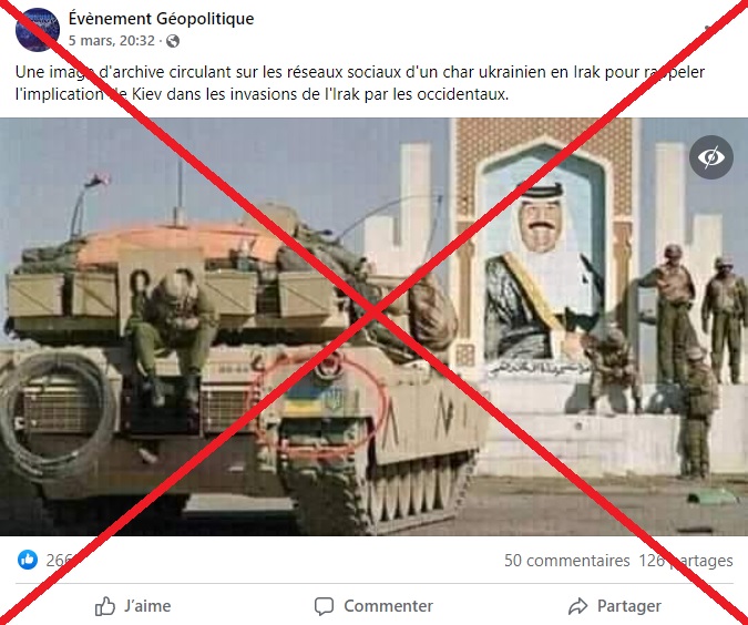 Dans la légende accolée, l'auteur de la publication en date du 5 mars prétend qu'il s'agit d'"une image d'archive circulant sur les réseaux sociaux d'un char ukrainien en Irak pour rappeler l'implication de Kiev dans les invasions de l'Irak par les occidentaux."