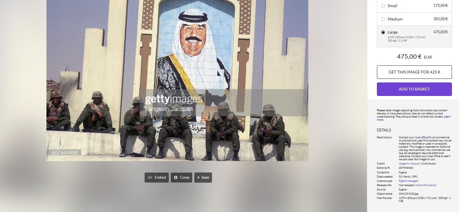 Sur ces dernières, des soldats se tiennent devant la même peinture murale de Saddam Hussein, le 1er janvier 1991 et le 1er mars 1991, soit plus de dix ans avant l'invasion américaine de l'Irak.