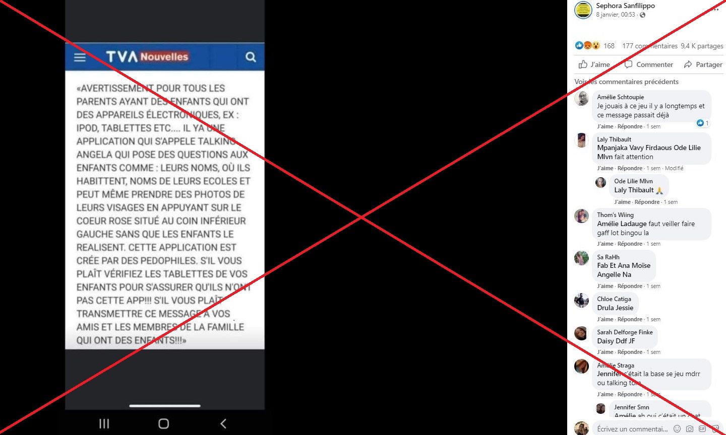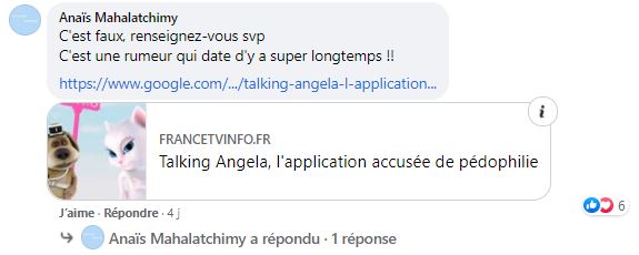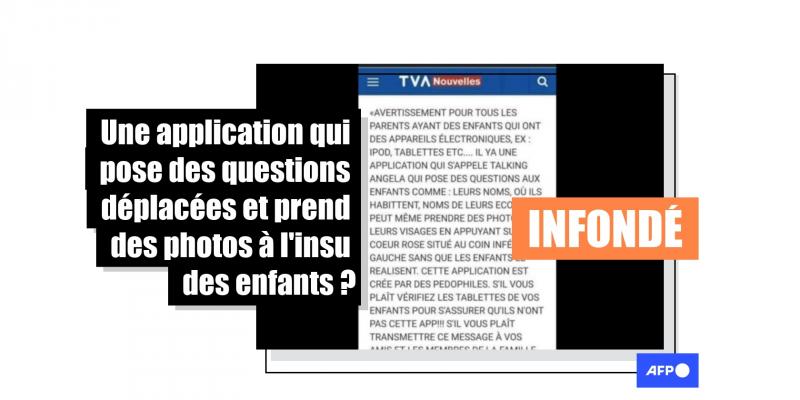 L'application de jeu Talking Angela aurait été "créée par des pédophiles" et poserait des questions déplacées aux enfants, qu'elle pourrait même prendre en photo à leur insu, selon une publication partagée plus de 9 000 fois sur Facebook. Mais cette rumeur, qui circulait déjà en 2013, est infondée. L'éditeur de l'application a dénoncé de "fausses allégations" et l'AFP, qui a téléchargé le jeu, n'a pu ni discuter avec "Angela" le chat, ni prendre de photos. En France comme en Belgique, la police a déclaré n'avoir connaissance d'aucune plainte concernant cette application.