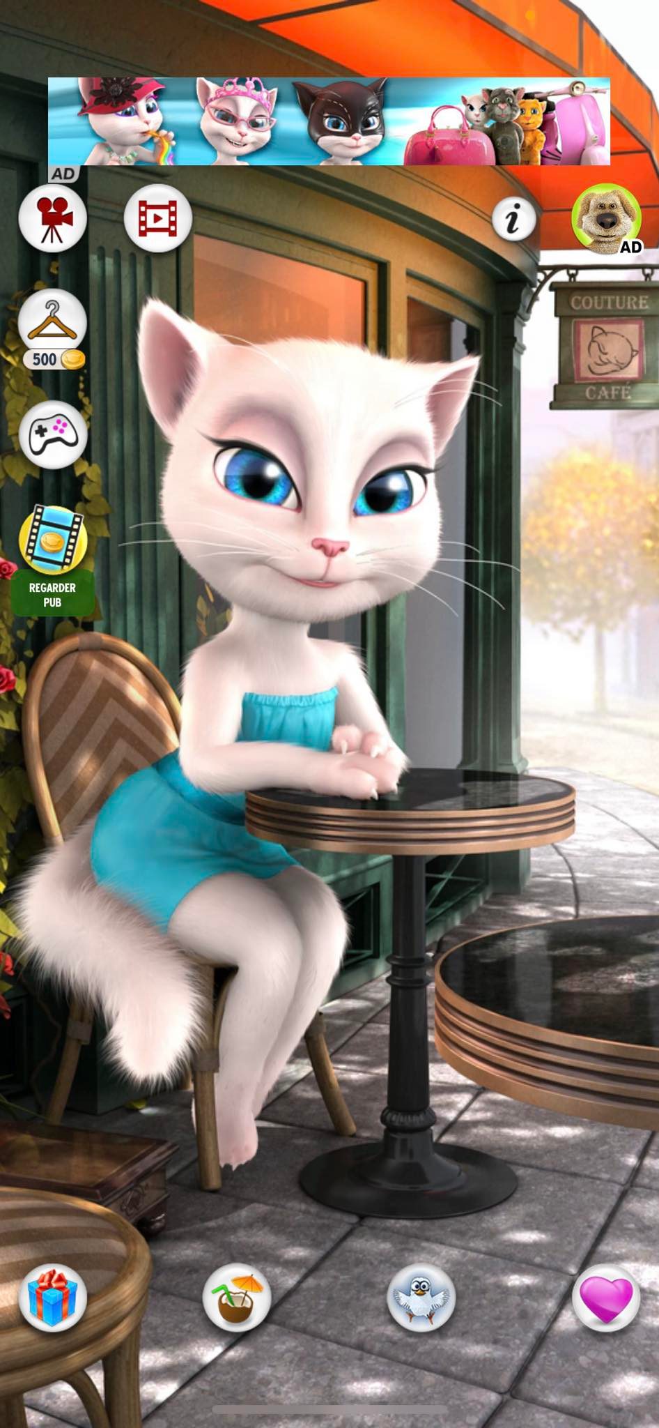 L'application Talking Angela fait partie de la série d'applications "Talking Tom and Friends", développées par la société britannique Outfit7. Dans ce jeu sur téléphone portable, le joueur doit s'occuper d'Angela, une chatte blanche qui répond aux stimulus et répète ce que le joueur dit à voix haute.