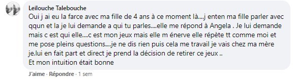 La publication partagée sur Facebook affirme que Talking Angela pose des "questions aux enfants comme: leurs noms, où ils habittent, noms de leurs écoles et peut même prendre des photos de leurs visages (...) sans que les enfants le réalisent".
