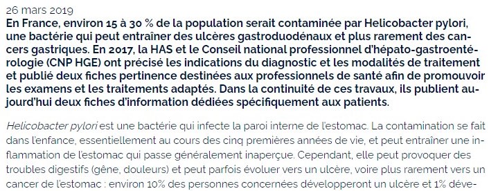 "La contamination se fait dans l'enfance, essentiellement au cours des cinq premières années de vie, et peut entraîner une inflammation de l'estomac qui passe généralement inaperçue", peut-on lire sur le site internet de la HAS. "Cependant, elle peut provoquer des troubles digestifs (gêne, douleurs) et peut parfois évoluer vers un ulcère, voire plus rarement vers un cancer de l'estomac : environ 10% des personnes concernées développeront un ulcère et 1% développeront un cancer de l'estomac".