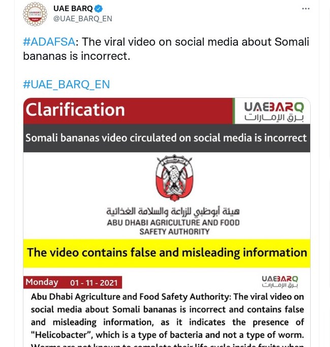 "Récemment, 500 tonnes de bananes de Somalie sont arrivées sur les marchés, qui contiennent un ver appelé Helicobacter qui libère des bananes vénéneuses dans l'estomac, qui présente alors les symptômes suivants (diarrhée, vomissements, nausées, maux de tête) et après 12 heures la personnes mourra de la mort cérébrale. Veuillez vous abstenir d'acheter et de manger des bananes ces jours-ci, ou si vous en achetez, assurez-vous de les ouvrir à l'intérieur" , lit-on dans des publications partagées sur Facebook et Twitter dans plusieurs langues et dans plusieurs pays.