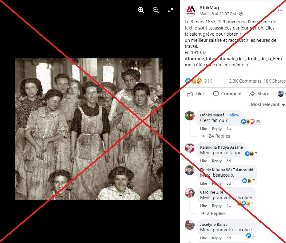 "Le 8 mars 1857, 129 ouvrières d'une usine de textile sont assassinées par leur patron", affirment plusieurs publications virales sur Facebook, partageant une photo sépia de femmes en tablier pour illustrer cette rumeur.