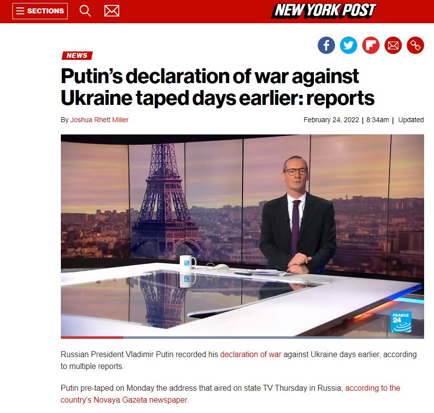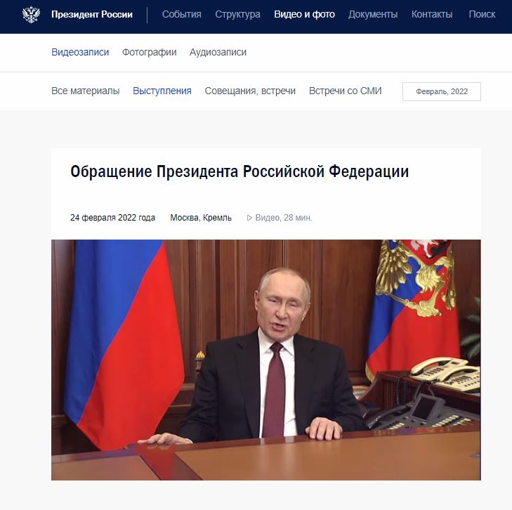 Dans le cas de l'annonce de l'invasion de l'Ukraine par Vladimir Poutine, la vidéo a été publiée le 24 février 2022 sur la version russe du site du Kremlin.