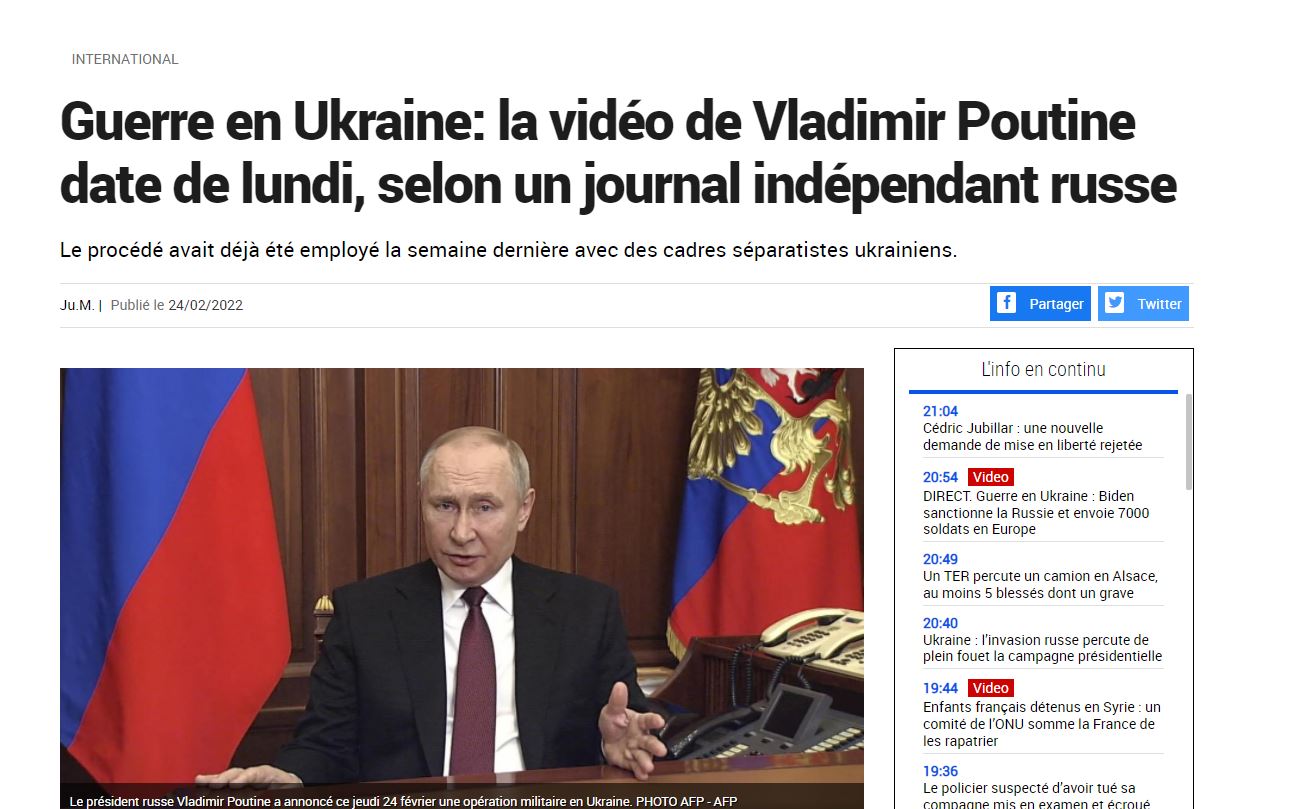 Se basant sur les métadonnées du discours de Vladimir Poutine annonçant l'invasion de l'Ukraine, le journal d'investigation russe Novaïa Gazeta a affirmé que cette allocution aurait été enregistrée trois jours avant sa diffusion, le 21 février 2022. Mais les métadonnées de la vidéo datent bien du 24 février, et l'erreur vient d'une confusion avec une autre vidéo, a reconnu le média. Cela ne constitue pas pour autant une preuve irréfutable de la chronologie de cet enregistrement : la Russie a déjà, à plusieurs reprises, mis en scène des vidéos à des fins stratégiques, souligne un spécialiste interrogé par l'AFP.