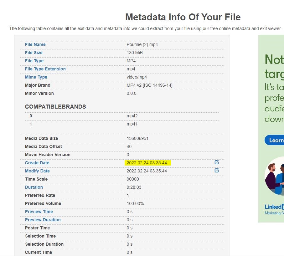Cela n'est néanmoins pas une preuve formelle que la vidéo a été tournée le 24 février. Les métadonnées, facilement manipulables, pourraient avoir été postdatées pour faire croire que l'enregistrement a été tourné le jour-même.