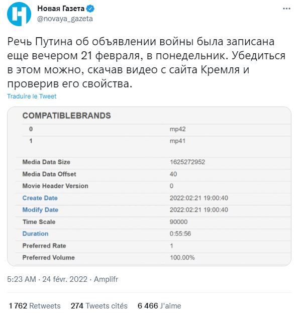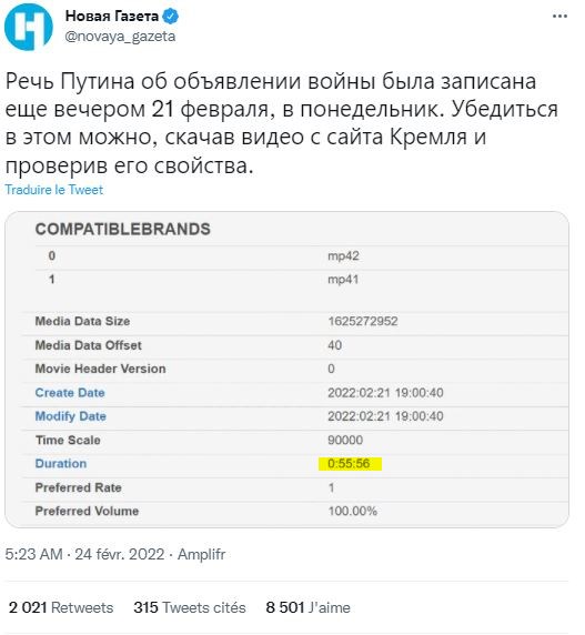 "Le discours de déclaration de guerre de Poutine a été enregistré lundi 21 février au soir. On peut le vérifier en téléchargeant la vidéo du site internet du Kremlin, et en vérifiant les métadonnées", a écrit le journal sur Twitter le 24 février, capture d'écran à l'appui.