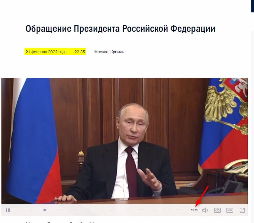 Sur le site du Kremlin, il existe bien une vidéo de 55 minutes, mais elle date du 21 février 2022. Tout semble indiquer que Novaïa Gazeta a extrait par erreur les métadonnées de cette ancienne vidéo prise dans un décor extrêmement similaire à celle du 24 février, car les métadonnées de ces anciennes images correspondent ainsi en tous points à celles partagées dans le tweet du journal russe.