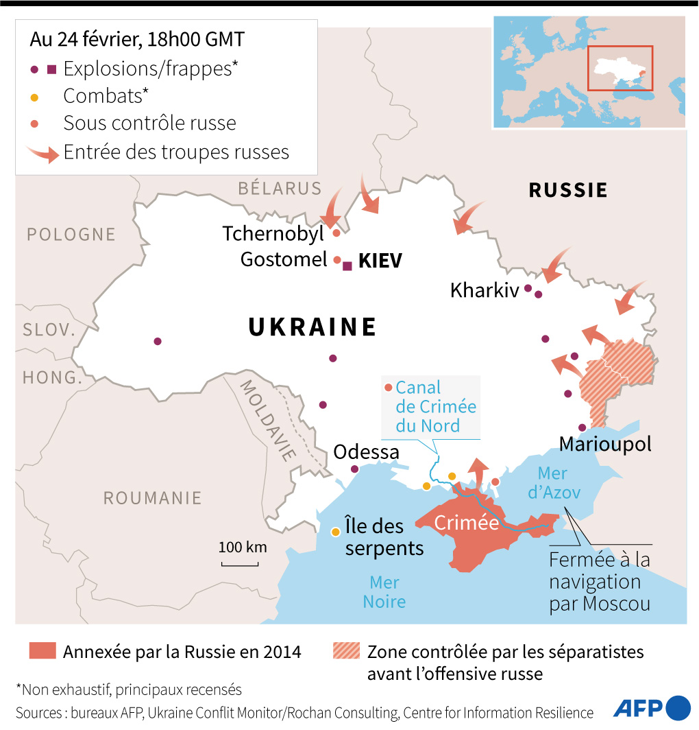 Au lendemain de l'attaque massive lancée contre l'Ukraine par Vladimir Poutine, des combats sont toujours en cours ce vendredi 25 février, à Kiev et au nord de la capitale ukrainienne. Le président Volodymyr Zelensky a affirmé que l'armée russe visait des zones civiles, entraînant une avalanche de sanctions internationales.