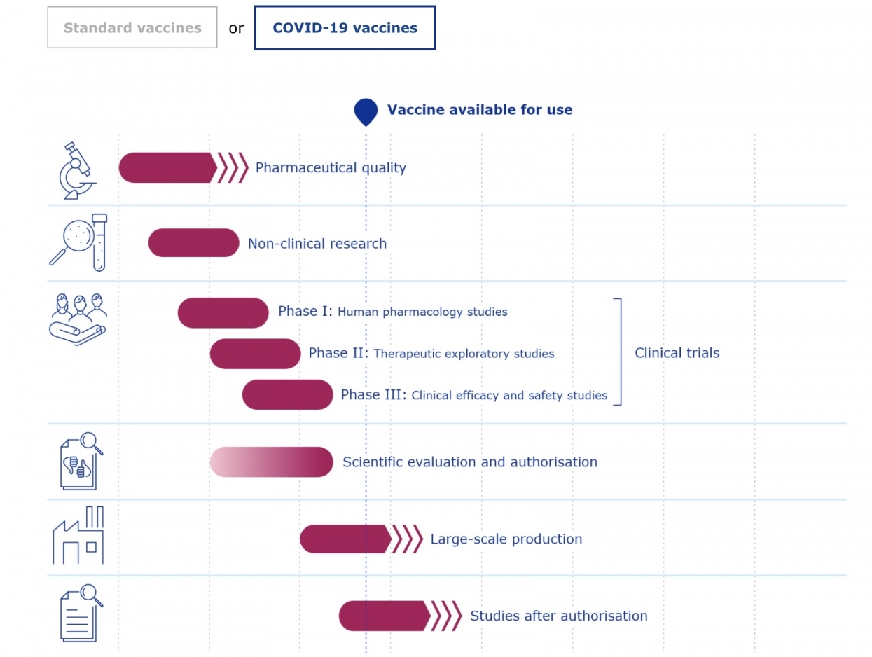 Mais cela n'a pas empêché les vaccins contre le Covid-19 autorisés en France de suivre les étapes imposées à chaque traitement avant une mise sur le marché européen et hexagonal: une première phase pour évaluer l'éventuelle nocivité du produit, une deuxième pour le tester sur un nombre limité de malades et une troisième pour juger de l'intérêt thérapeutique auprès d'un échantillon plus étendu.