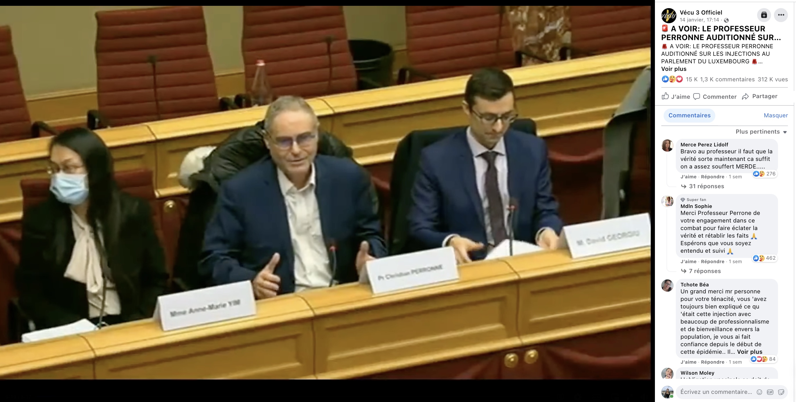 Dans l'extrait que nous examinons, relayé des dizaines de milliers de fois en deux semaines (1, 2, 3) sur les réseaux sociaux, le professeur Perronne s'exprime devant la Chambre des députés du Luxembourg, le 12 janvier 2022. Il y avait été invité aux côtés de la généticienne Alexandra Henrion-Caude et le professeur Luc Montagnier, qui ont relayé de nombreuses infox sur le Covid, comme expliqué dans ces articles de l'AFP (1, 2, 3, 4)