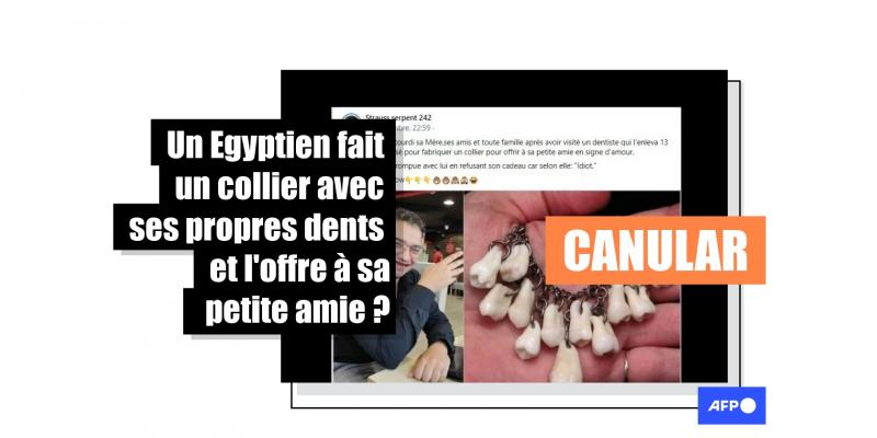 Des publications largement partagées sur Facebook depuis mi-novembre affirment qu'un Egyptien s'est fait arracher les dents pour confectionner un collier et l’offrir à sa compagne. Mais il s’agit d’un canular. L'homme a expliqué à l'AFP avoir volontairement modifié sa photo pour faire cette blague, que beaucoup d'internautes prennent au premier degré, et ainsi se moquer des manières parfois excentriques de prouver son amour à sa dulcinée. La photo du bijou en dents, elle, est bien réelle: on la trouve sur internet depuis au moins 2016.