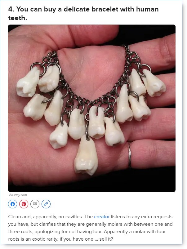 Le quatrième accessoire cité dans cet article est décrit comme "un bracelet délicat avec des dents humaines" et contient un lien vers une boutique américaine appelée BoneLust sur le site de vente en ligne, Etsy.