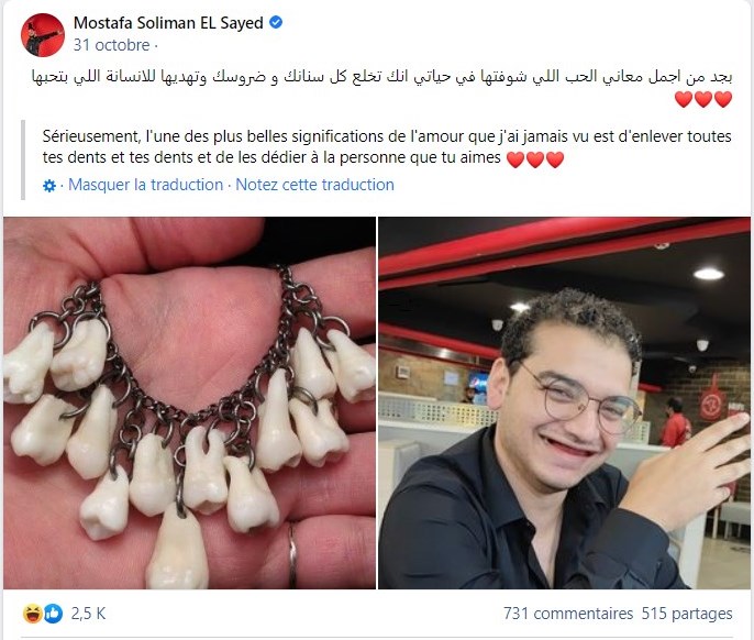 Écrit en arabe, le post Facebook d'El Sayed du 31 octobre 2021 (également archivé ici), a été partagé plus de 500 fois. La légende signifie : "Sérieusement, l'une des plus belles preuves d’amour que j'aie jamais vue dans ma vie est de retirer toutes ses dents et molaires et les offrir à la personne qu’on aime".