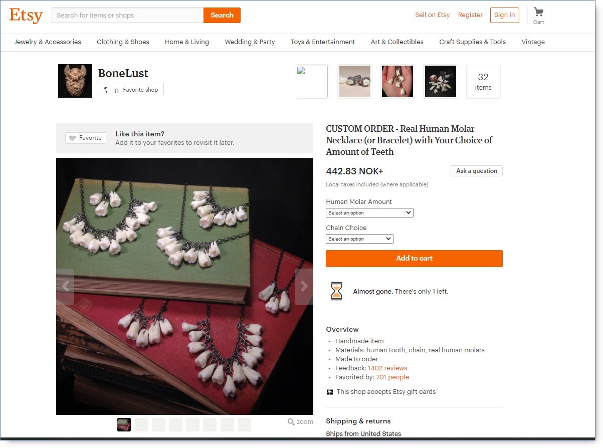 Sur la page archivée d'Etsy, la description associée au collier en dents mentionne "véritable collier molaires humaines (ou bracelet)" et prévient le potentiel client que sa commande peut être personnalisée (nombre de dents, longueur de la chaîne).