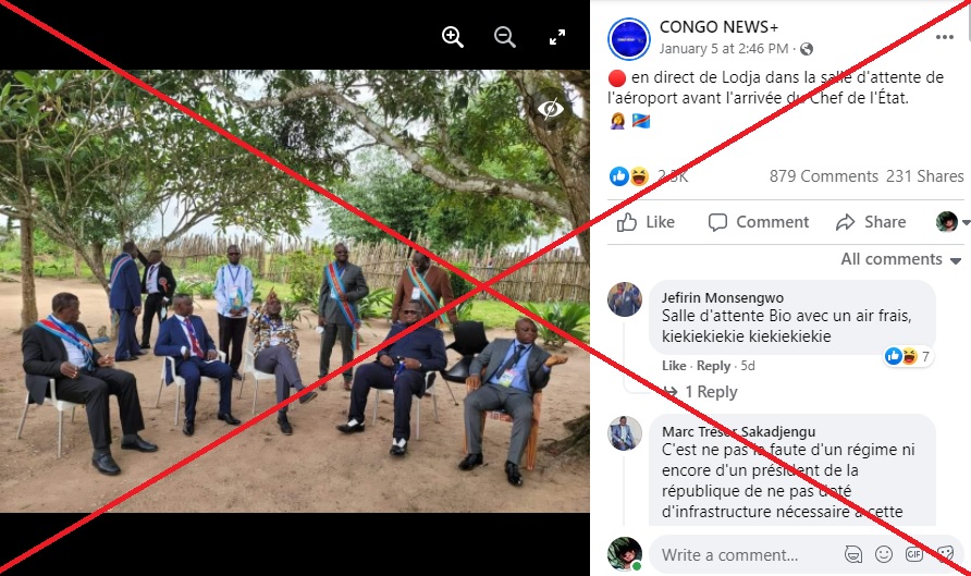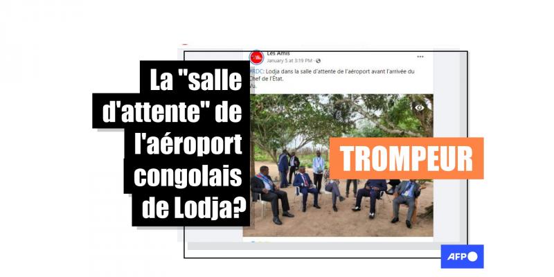 Cinq chaises installées à même la terre battue, et pour tout plafond, la ramure d'un manguier. Voilà en quoi consiste la "salle d'attente" de l'aéroport de Lodja, dans le centre de la République démocratique du Congo selon les internautes qui ont fait circuler cette affirmation. La publication est accompagnée d'une photo de plusieurs responsables politiques installés sur ces chaises. Cette rumeur a été partagée plus de 900 fois sur les réseaux sociaux dans ce pays depuis le 5 janvier. De nombreux commentaires s'indignent de l'infrastructure apparemment sommaire de cet aéroport et blâment les politiciens congolais. Attention: bien qu'elle soit en effet "modeste" selon le ministre des Transports congolais, il existe une réelle salle d'attente à l'intérieur de l'aéroport, et non pas à l'extérieur comme prétendent les internautes.