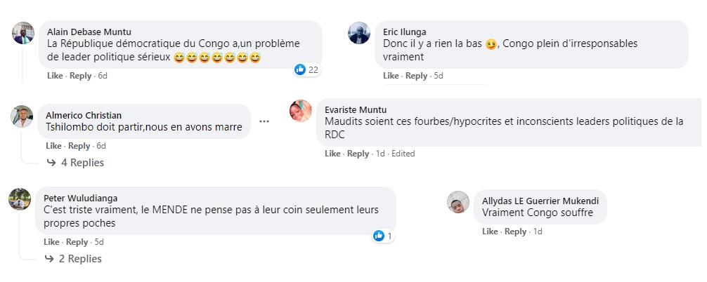 Pêle-mêle, les différents responsables politiques du pays sont vilipendés: "Tshilombo [Félix Tshisekedi, ndlr] doit partir", affirme l'un des internautes, tandis qu'un autre reproche à Lambert Mende, un des députés de la province visibles dans la photo, de ne pas penser "à [son] coin" mais seulement à ses "proches".