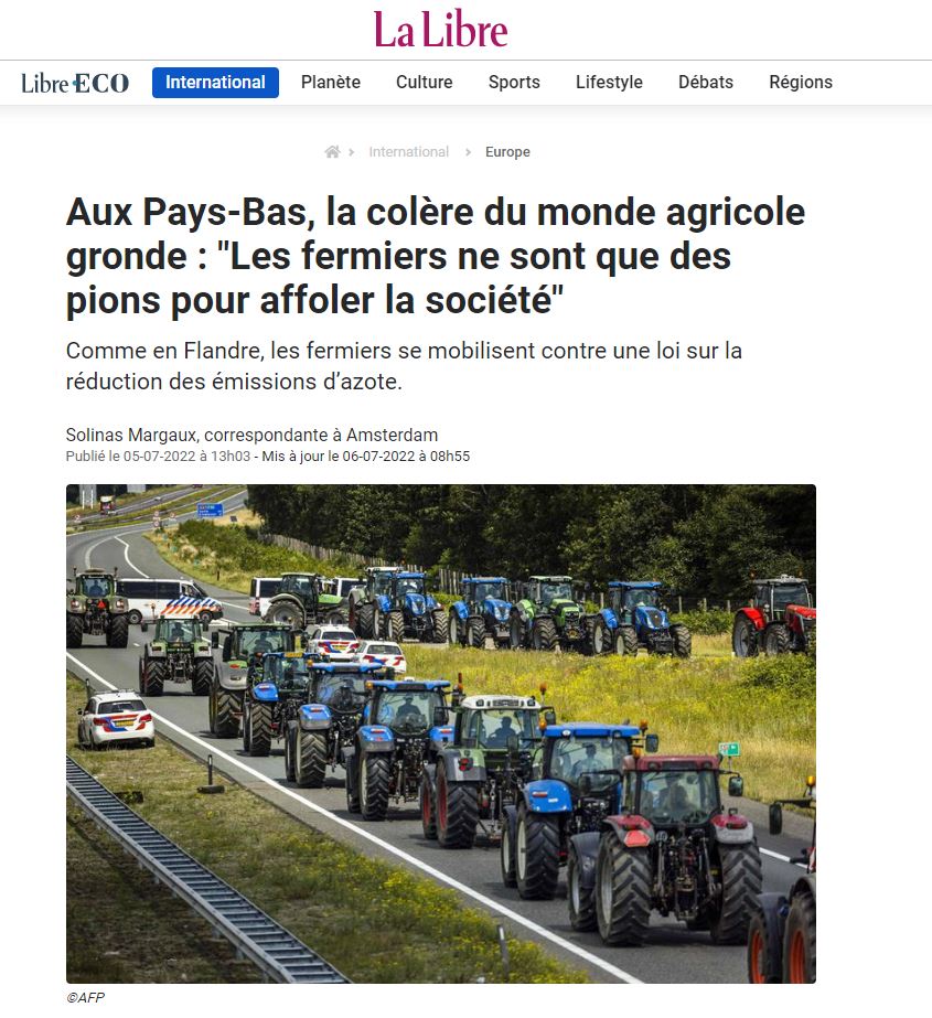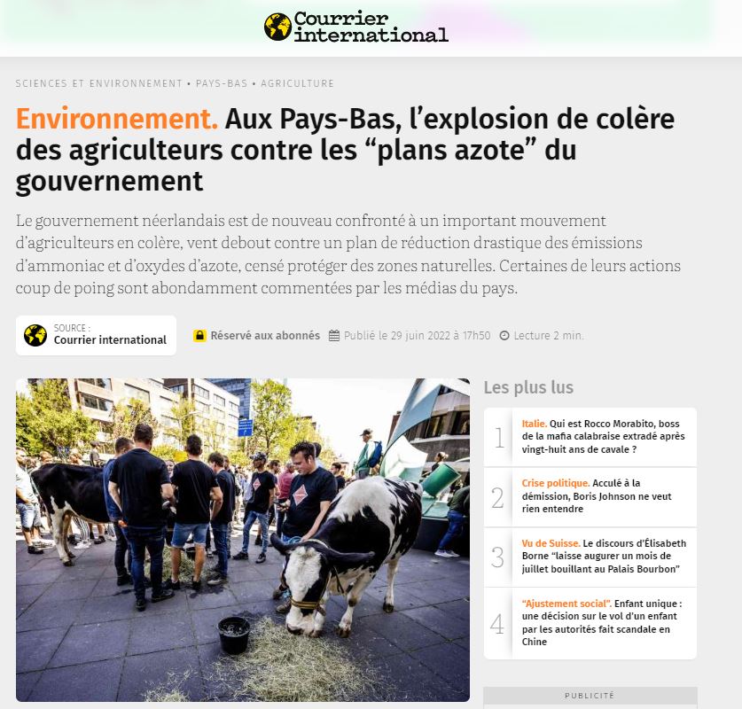 En juillet 2022,le gouvernement néerlandais a, à nouveau, provoqué la colère d'agriculteurs en annonçant le 10 juin un plan de grande ampleur pour faire baisser les rejets d'azote jusqu'à 70% dans 131 zones clés du pays (dont la plupart sont proches de réserves naturelles et de terres protégées) afin d'atteindre ses objectifs environnementaux d'ici 2030.