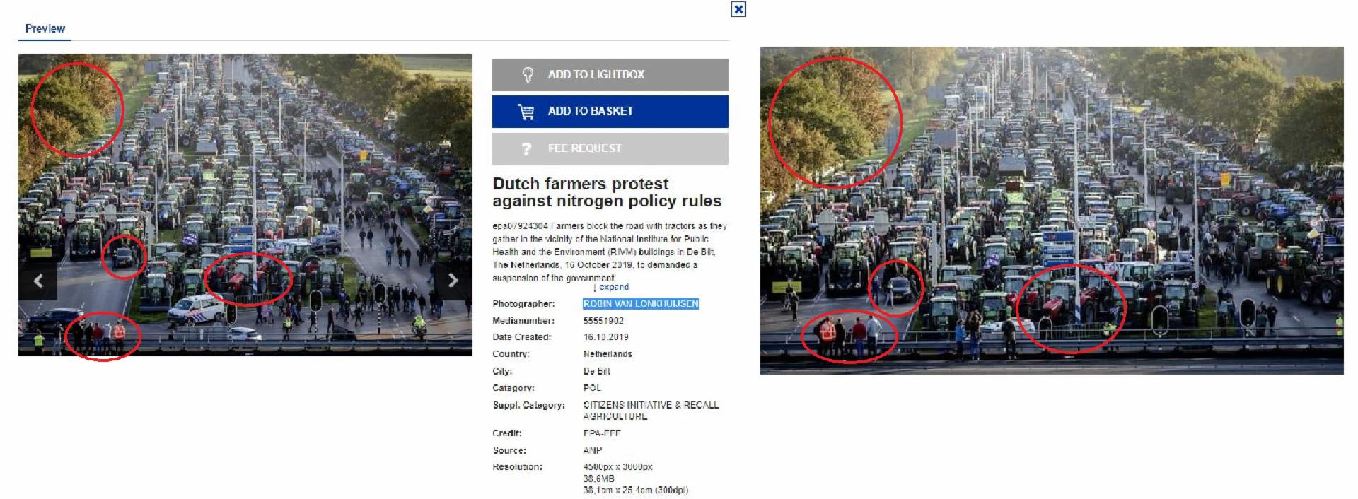 Plusieurs détails sur l'image partagée sur les réseaux sociaux permettent de constater qu'il s'agit d'une photographie de la même scène. Certaines personnes qui apparaissent en bas de l'image sont par exemple reconnaissables à leurs vêtements : l'une d'entre elles porte une veste de sécurité orange fluo, une autre un pull rouge et une troisième un pull gris. On peut également retrouver la petite voiture garée sur la voie de gauche devant les tracteurs, le tracteur rouge qui se trouve au centre de l'image entre des tracteurs verts, ainsi que les arbres aux couleurs de feuilles différentes dont l'un d'entre eux dépasse sur le bord de la route, à gauche sur l'image.