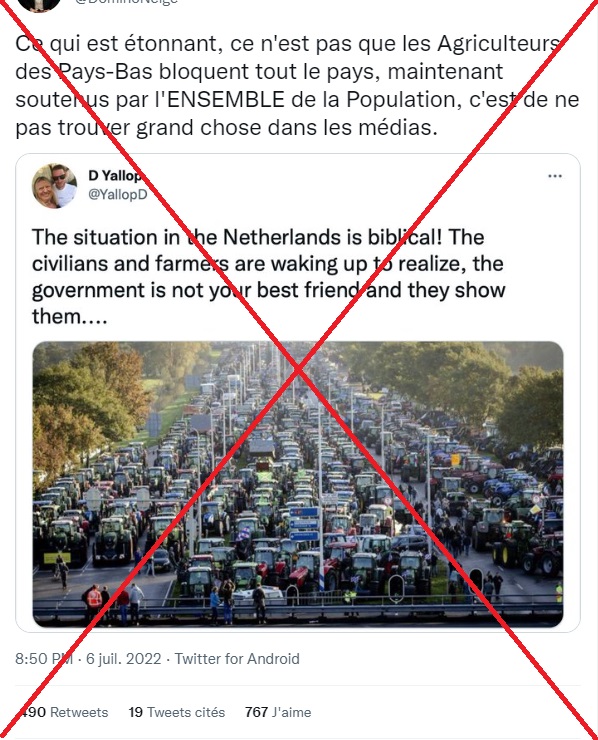 Début juillet, des agriculteurs opposés à un plan du gouvernement néerlandais destiné à réduire les émissions d'azote manifestent aux Pays-Bas. Des publications partagées plusieurs centaines de fois et vues des dizaines de milliers d'autres ont diffusé une photo censée avoir été prise sur place, assortie de commentaires dénonçant l'absence de mentions de ces manifestations dans les médias francophones. Elles sont trompeuses : la photo a été prise en 2019, lors du blocage d'une route à De Bilt, aux Pays-Bas, lors de précédentes manifestations d'agriculteurs. Par ailleurs, plusieurs médias, dont l'AFP, ont bien fait part des mobilisations de ces derniers jours aux Pays-Bas.