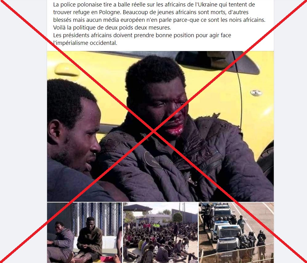 "La police polonaise tire à balle réelle sur les Africains de l'Ukraine qui tentent de trouver refuge en Pologne. Beaucoup de jeunes Africains sont morts, d'autres blessés", écrit l'auteur de cette publication intitulée "Négrophobie/Pologne". Il poursuit: "aucun média européen n'en parle parce que ce sont les noirs africains. Voilà la politique de deux poids deux mesures. Les présidents africains doivent prendre bonne position pour agir face à l'impérialisme occidental". Cette publication illustrée par quatre photos a enregistré plus de 1.000 partages depuis le 10 mars.
