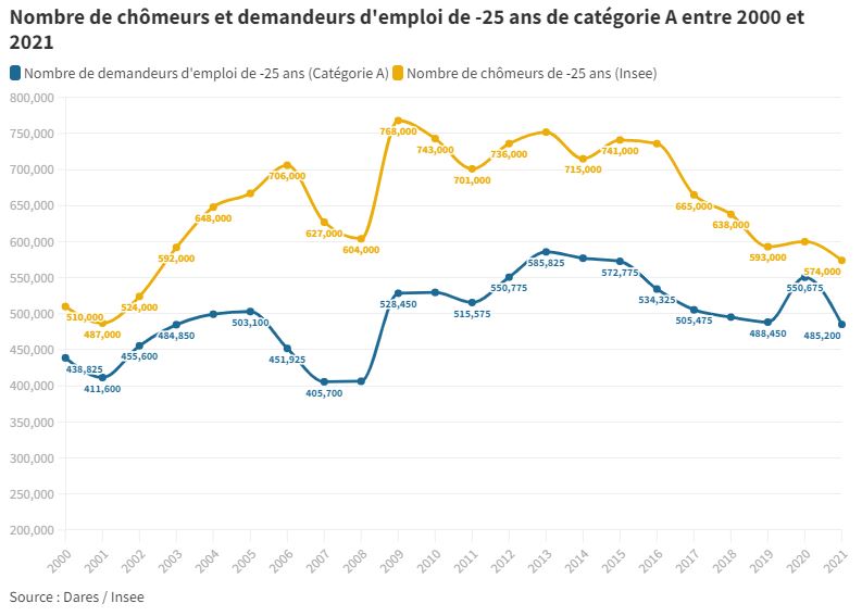 Mais lorsque l'on prend en compte l'ensemble de l'année 2021, la baisse du chômage des jeunes n'est pas aussi historique que ce qu'affirme le gouvernement. Selon l'Insee, on trouve trace d'un taux plus faible en 2002 (17,8% en 2002, contre 18,9% en 2021).