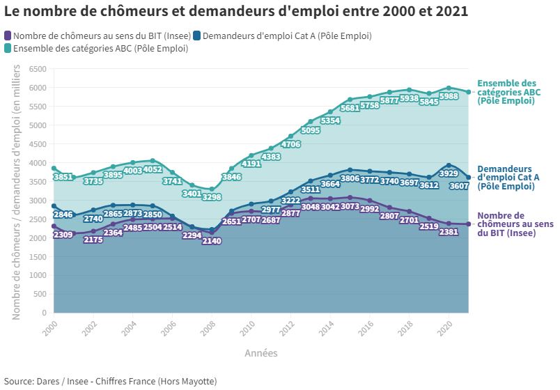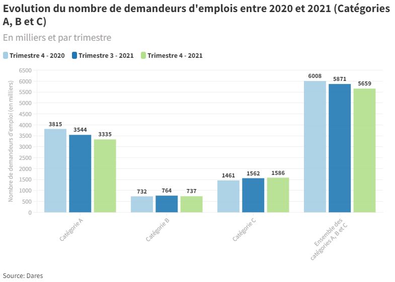 Selon les chiffres de la Dares (France hors Mayotte), si l'on additionne les catégories A, B et C, au 4e trimestre 2021, on recense 5.658.900 demandeurs d'emploi. Contre 5.813.400 au premier trimestre 2017. Soit une différence de 154.500.