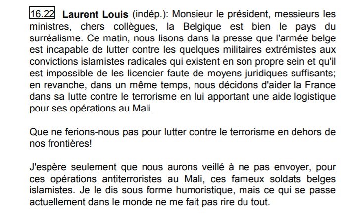 Dans ce discours d'onze minutes et 20 secondes, un homme politique belge regrette "l'aide logistique" apportée par son pays à la France dans le cadre de la "lutte contre le terrorisme au Mali". Il estime que l'intervention française cache en réalité une volonté "de défendre des intérêts financiers" et de "violer la souveraineté" du pays d'Afrique de l'Ouest.