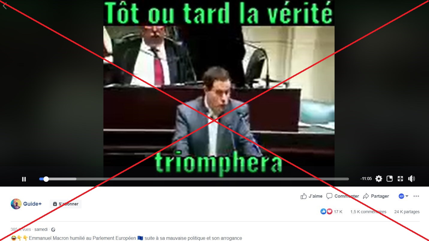 "Emmanuel Macron humilié au Parlement Européen suite à sa mauvaise politique et son arrogance", affirme la page Guide+ qui diffuse la vidéo. Cette page consacre la plupart de ses publications à l'actualité malienne.