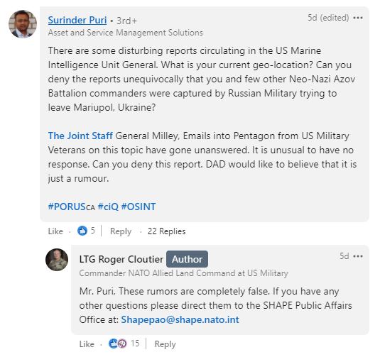 "Des rumeurs circulent en ligne, selon lesquelles le Lieutenant Général Roger Cloutier, commandant des forces alliées terrestres, a été capturé en pleine activité militaire en Ukraine, plus spécifiquement à Marioupol", a détaillé un porte-parole de SHAPE.