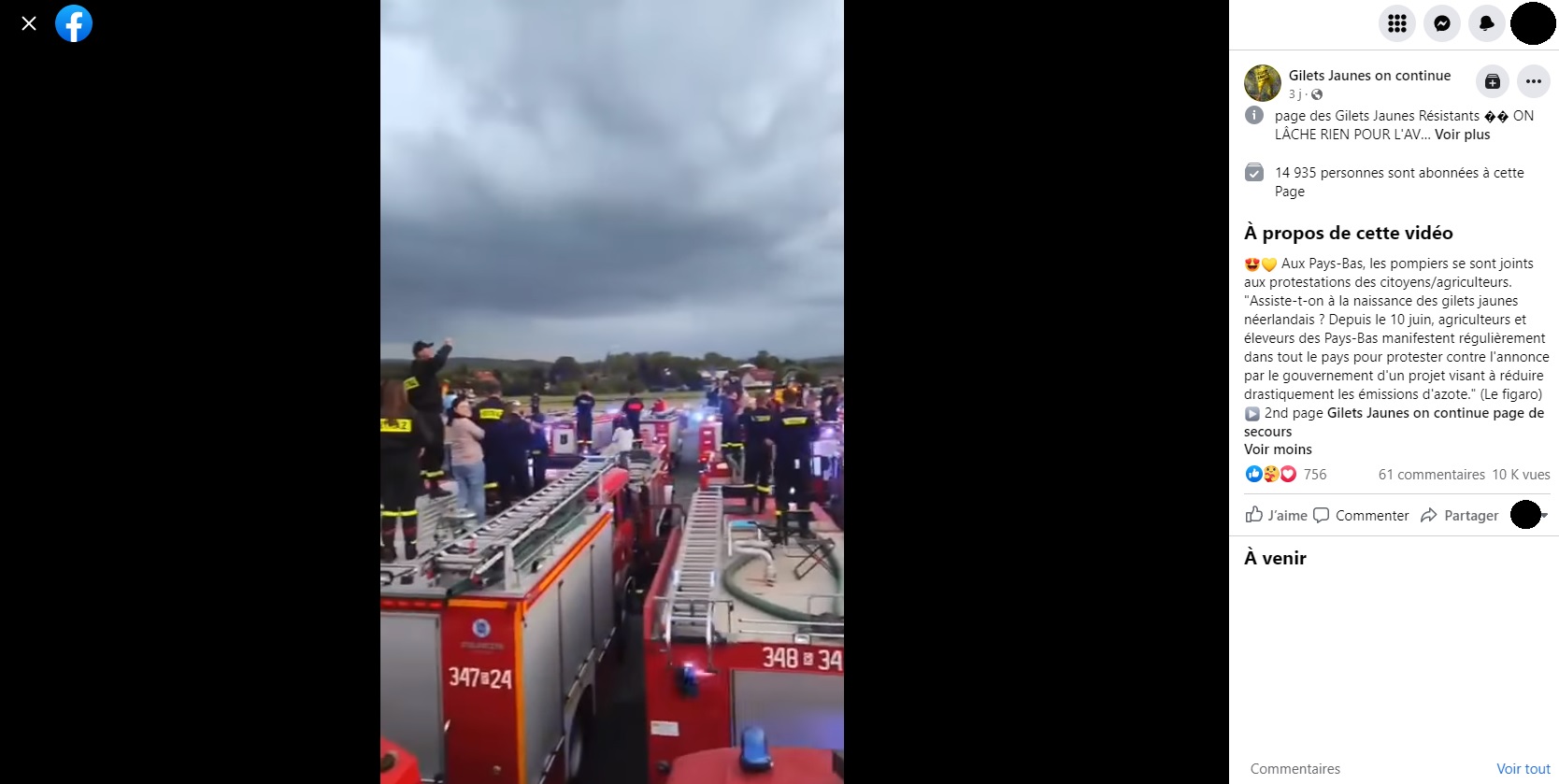 "Aux Pays-Bas, les pompiers se sont joints aux protestations des citoyens/agriculteurs", affirment plusieurs internautes qui partagent la vidéo sur Facebook (1, 2). Dans celle-ci, on voit plusieurs camions de pompiers, sirènes allumées, et des personnes en uniforme sur les toits des véhicules.