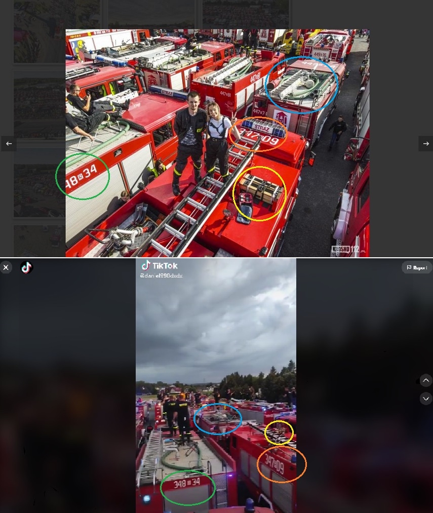 Le camion de pompier marqué du numéro "347R64" apparaît dans d'autres vidéos du même compte TikTok polonais, et il est également écrit "Jedlicze" dessus. Il s'agit du nom d'une ville dans le comté de Krosno.
