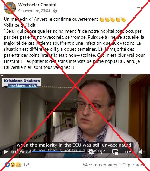 Une vidéo de 33 secondes, tournée dans un hôpital, a été relayée plusieurs milliers de fois sur Twitter et Facebook depuis début novembre. Il s'agit de l'interview d'un médecin belge, qui déclare en flamand: "Chez nous, à l'heure actuelle, nous voyons une majorité de ce qu'on appelle des infections de percée. C'est différent de ce qu'on voyait il y a quelques semaines, lorsque nous avions en effet une majorité de patients non vaccinés dans les soins intensifs. A l'heure actuelle, ce n'est plus le cas. Les patients (infectés par le Covid, ndlr) que nous avons en soins intensifs dans les hôpitaux (du groupe hospitalier) GZA, j'ai vérifié hier, sont tous vaccinés".
