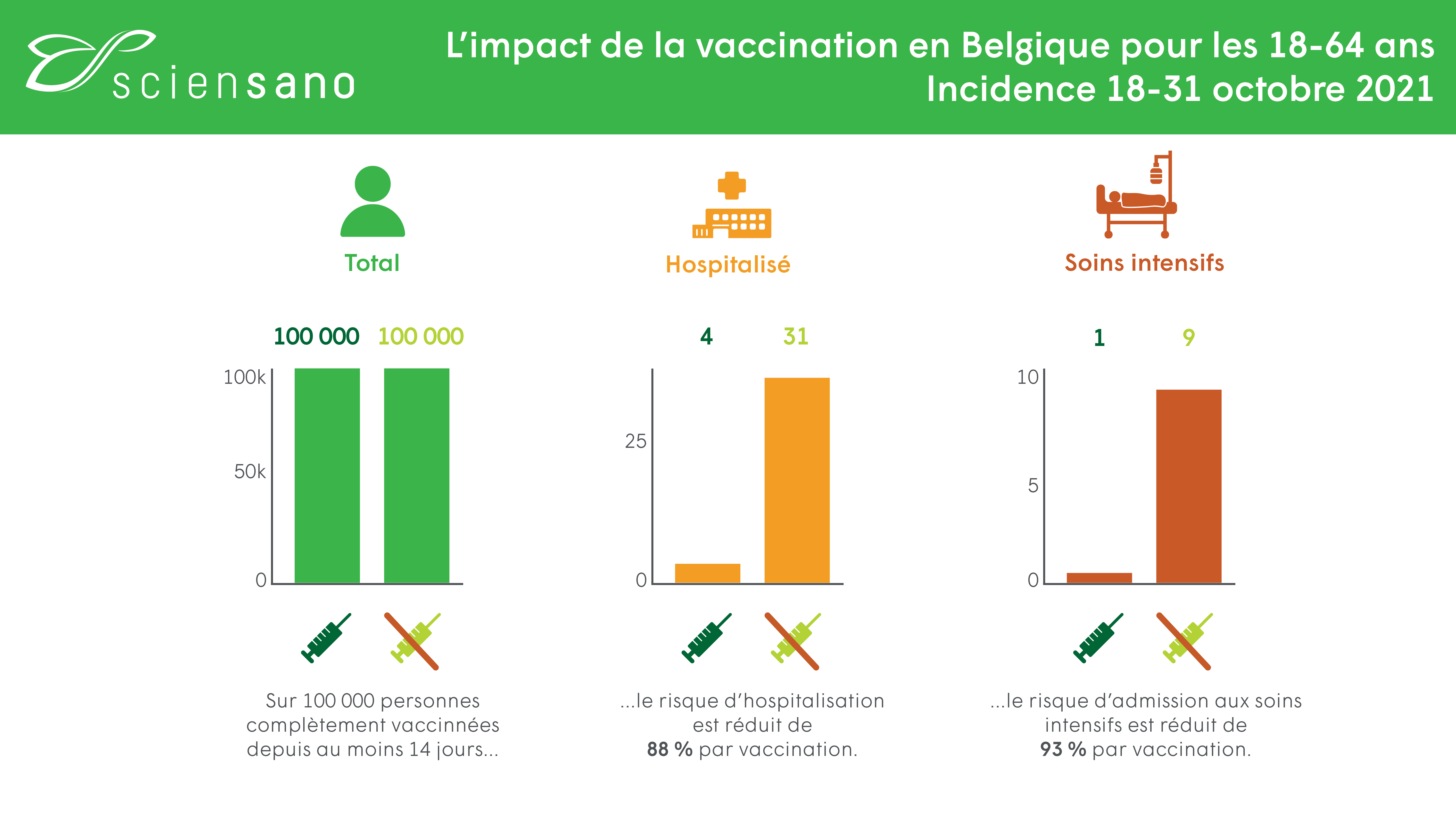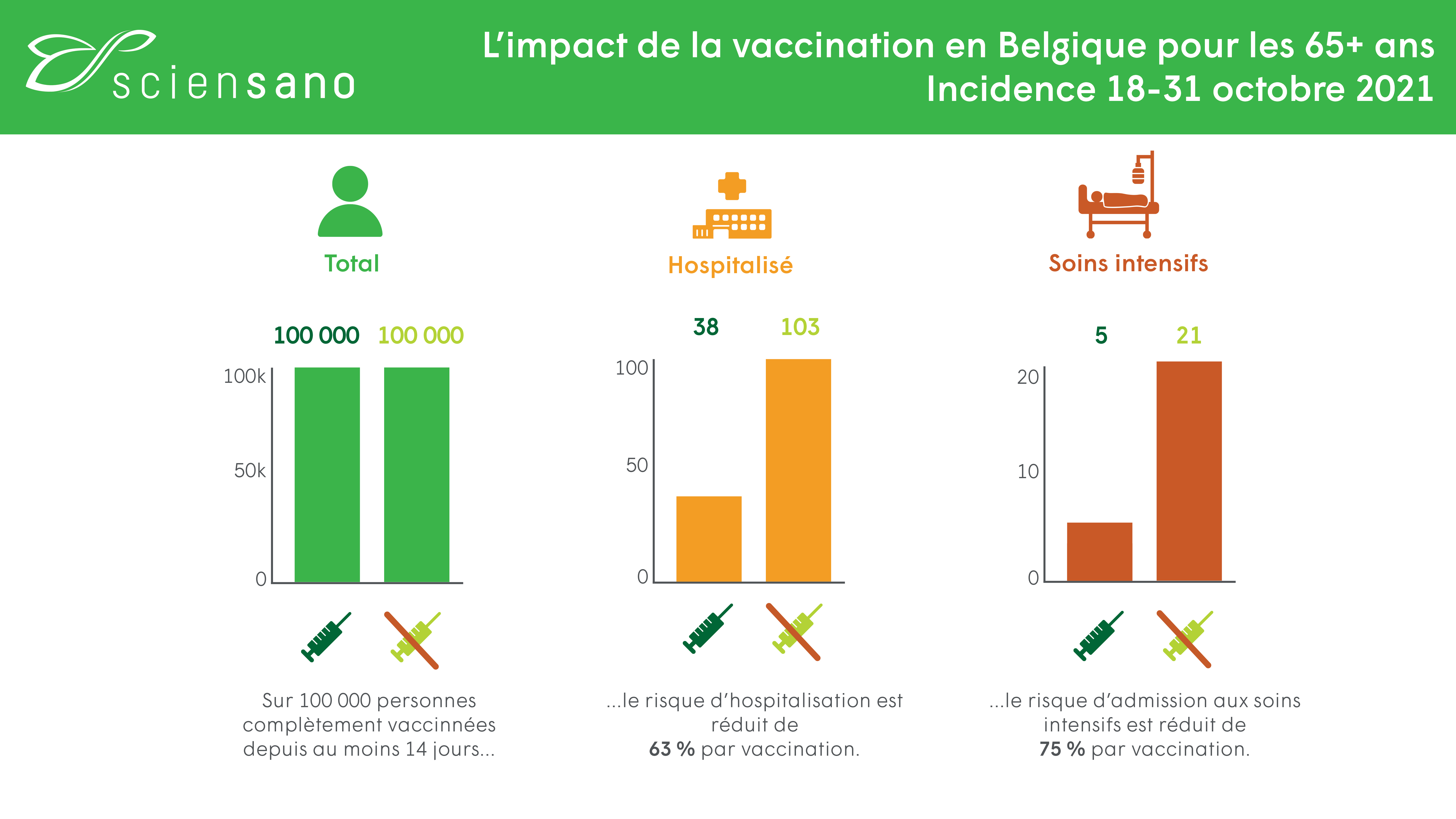 Selon ces études de Sciensano , le risque d'admission aux soins intensifs chez les personnes immunisées (c'est-à-dire entièrement vaccinées), sur la période 1er au 14 novembre 2021, a été réduit de 80% pour les plus de 65 ans, et de 88% pour les 18-64 ans.