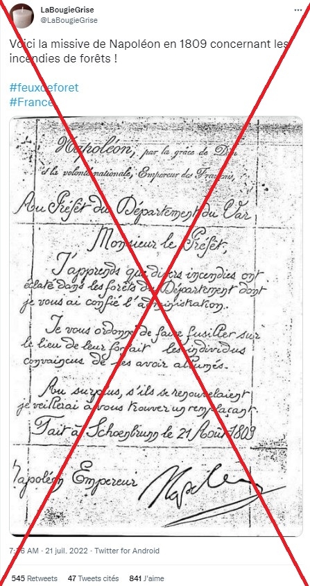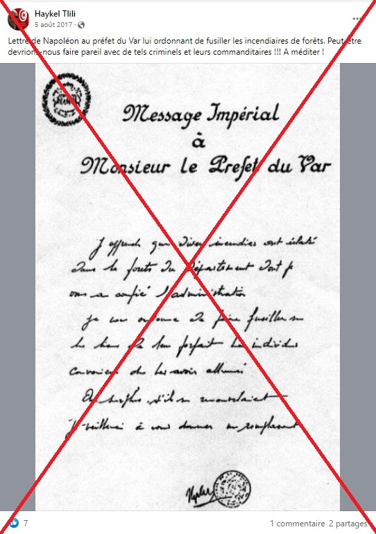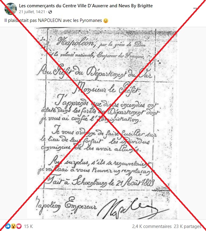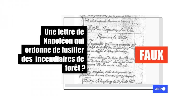 Deux fac-similés d’une lettre attribuée à Napoléon et adressée au préfet du Var le 21 août 1809 ont été partagés plus de 24 000 fois sur Facebook depuis le 21 juillet 2022, ainsi que sur Twitter. L’empereur y ordonnerait l’exécution d’incendiaires ayant allumé des feux de forêts. Certains internautes y voient la preuve que la justice d’antan était plus sévère. Mais les historiens interrogés par l’AFP assurent que ce courrier, dans ses deux versions, est un "faux grossier", qui circule depuis des décennies.