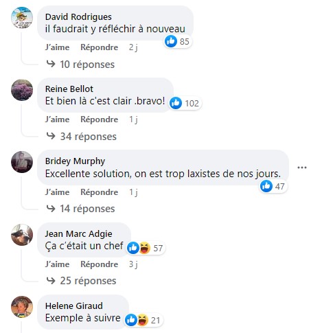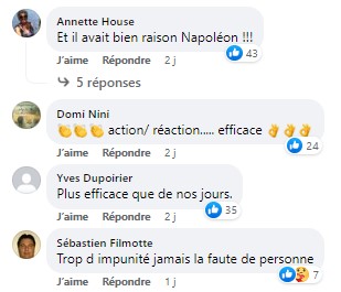 Sur Facebook, plusieurs internautes y voient une preuve de la dureté napoléonienne en comparaison de la supposée permissivité de la justice moderne. "Excellente solution, on est trop laxistes de nos jours", écrit l’un d’entre eux. "Un peu différent des procédures actuelles", note un autre. "Il faudrait y réfléchir à nouveau", va jusqu’à conseiller un autre commentateur.