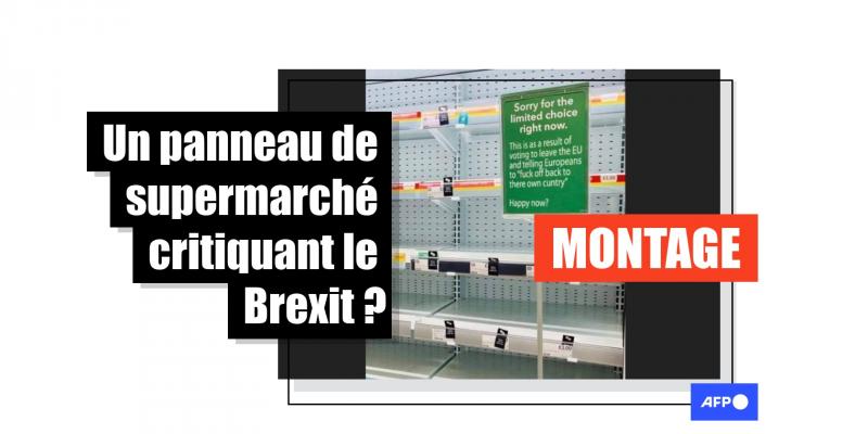 Une image partagée plus de 3 000 fois sur Facebook depuis fin septembre prétend montrer un écriteau affiché dans un supermarché britannique, lequel s'excuse pour le choix limité de produits, conséquence "d'avoir voté pour la sortie de l'UE et d'avoir dit aux Européens de retourner dans leur pays". Si le Royaume-Uni fait face à des problèmes d'approvisionnement touchant en particulier les stations-service et les supermarchés, cette affiche est fausse et a été modifiée. Le panneau original ne critique pas le Brexit.