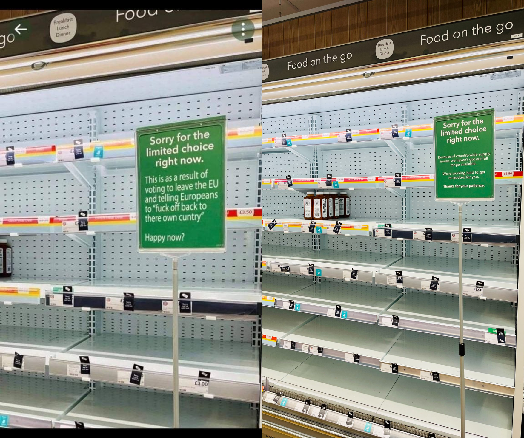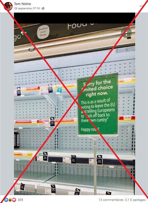 Sur Facebook, une photo partagée plus de 3 000 fois depuis le 29 septembre 2021 montre un panneau accroché dans les rayons d'un supermarché, sur lequel est écrit en anglais "Désolés pour le choix limité actuellement. C'est la conséquence d'avoir voté pour la sortie de l'UE et d'avoir dit aux Européens de retourner dans leur pays" - "to fuck off back to their own country" signifiant littéralement "de foutre le camp et retourner dans leur propre pays".