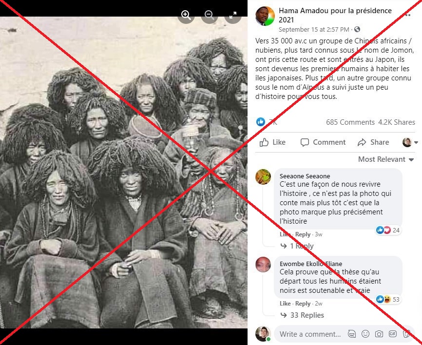 Une douzaine de personnes sont assises face à l'objectif. Vêtues de robes à manches longues, elles fixent le photographe. Certaines portent des colliers de perles, d'autres sont coiffées de petits chapeaux. Selon les internautes, il s'agit d'un "groupe de Chinois africains", les "Jomons", qui auraient voyagé du continent africain et seraient entrés au Japon, devenant ainsi "les premiers humains à habiter les îles japonaises"... "35.000" ans avant Jésus-Christ, affirment-ils.