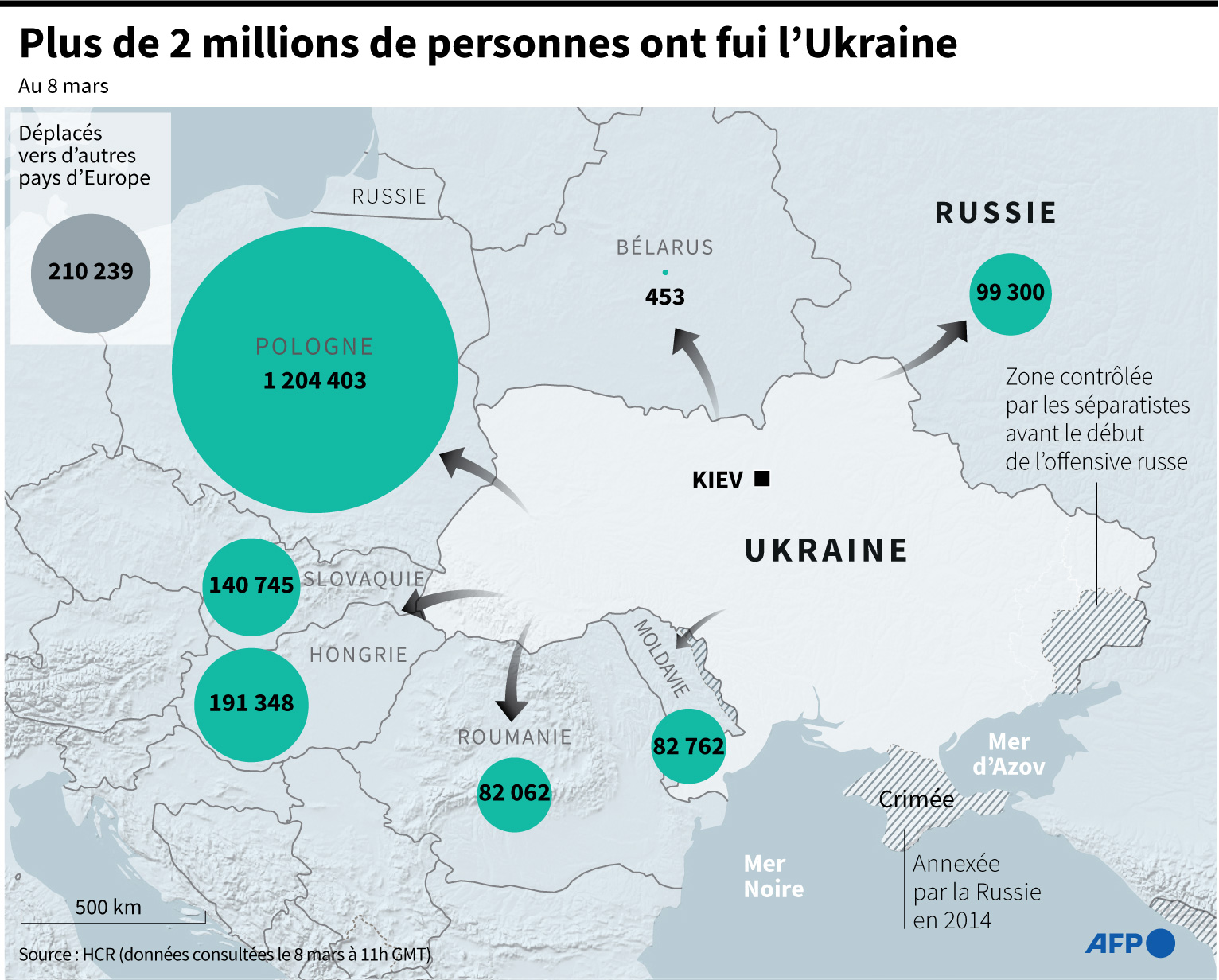 Le nombre de réfugiés qui ont fui l'Ukraine depuis l'invasion par l'armée russe le 24 février augmente de jour en jour, et est désormais estimé entre "2,1 et 2,2 millions de personnes", a déclaré le 9 mars le Haut Commissaire aux réfugiés Filippo Grandi lors d'une conférence de presse à Stockholm.
