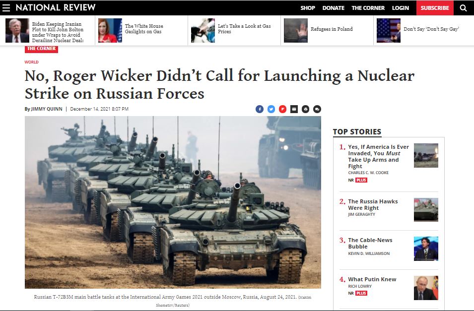 Une recherche d'image inversée sur le moteur de recherches russe Yandex permet de la retrouver sur le site du magazine américain National Review, illustrant un article intitulé "No, Roger Wicker Didn’t Call for Launching a Nuclear Strike on Russian Forces" ("Non, Roger Wicker - un sénateur américain républicain, Ndlr - n'a pas appelé à mener des frappes nucléaires contre les forces russes").