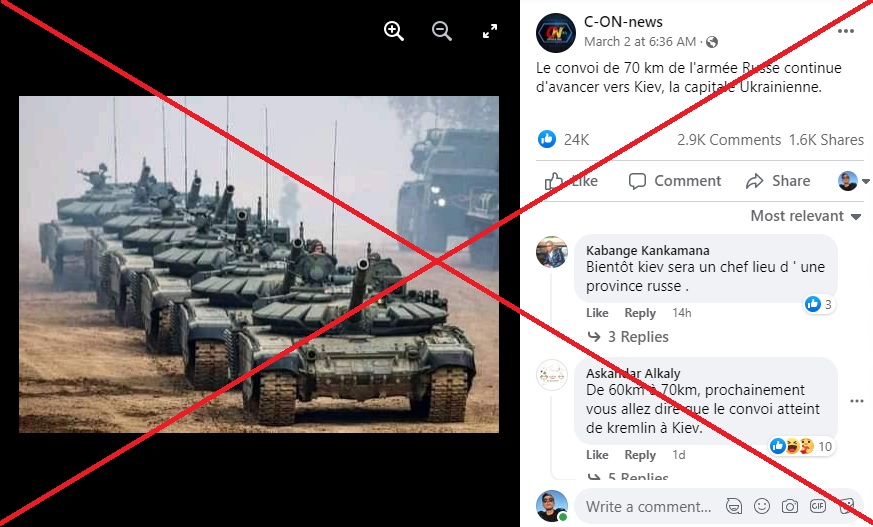 Une photo montrant une longue file de chars circule sur Facebook en Afrique. Les internautes qui la partagent prétendent qu'elle montre un "convoi de 70 km de l'armée russe" en route vers Kiev, la capitale ukrainienne, près de deux semaines après le début de l'invasion russe de l'Ukraine. Si des chars russes étaient bien positionnés à l'est de la ville au 9 mars, cette image virale a été prise en août 2021, six mois avant le début de la guerre.