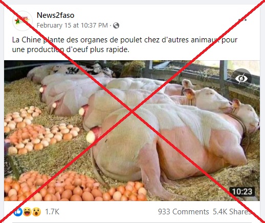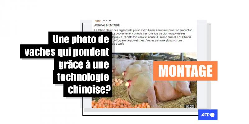 Une photo de plusieurs vaches imposantes couchées sur le flanc et pondant des œufs est utilisée sur Facebook par des internautes pour affirmer que "la Chine plante des organes de poulet chez d'autres animaux pour une production rapide d'œufs". Attention: il s'agit d'un photomontage.